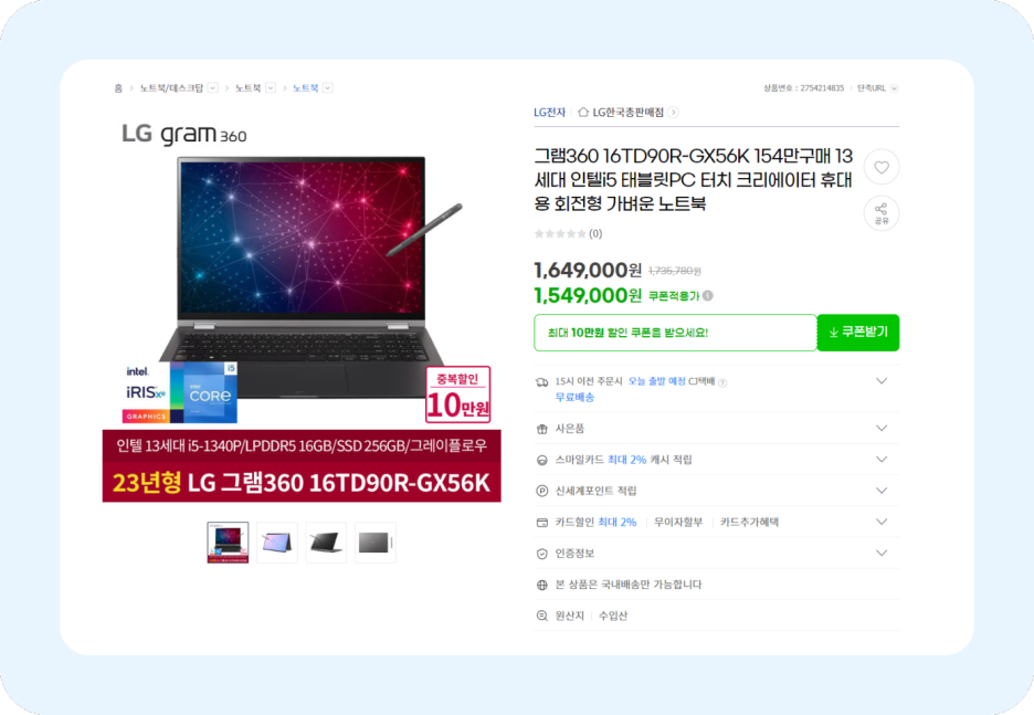 그러던 도중에 LG그램 16TD90R-GX56K 제품을 클릭해 보았어요!