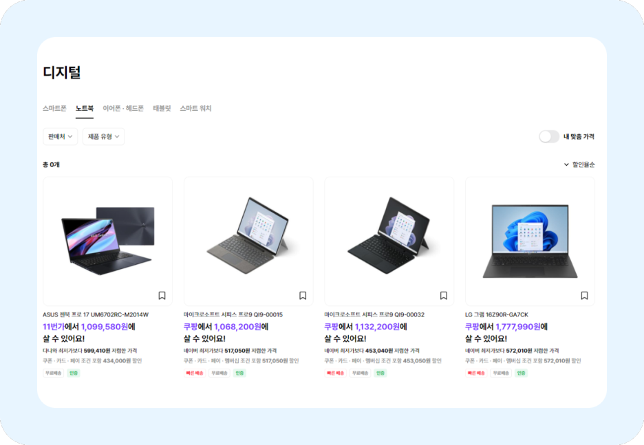 LG그램 16TD90R-GX56K 대신 할인율 높은 노트북 보고 싶다면, 사공사에서 노트북 카테고리를 확인해보세요! 네이버 가격비교보다 더 자세히 최저가 전부 모아 보여드릴게요 🤩