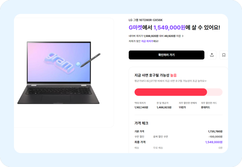 지금 G마켓에서 1,549,000원에 최저가로 구매할 수 있었는데, 한 달 평균가가 1,466,923원이었거든요