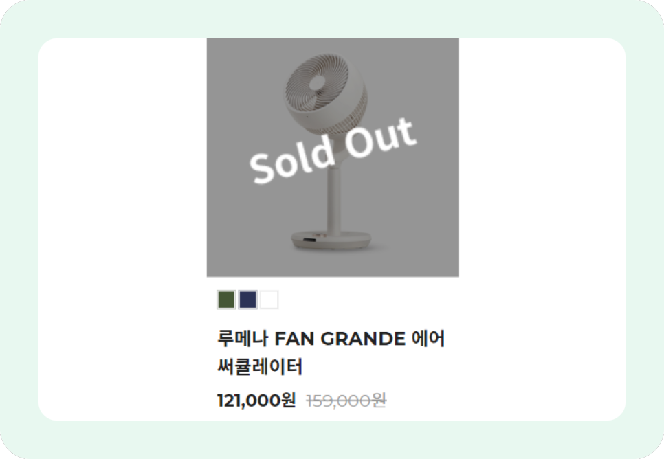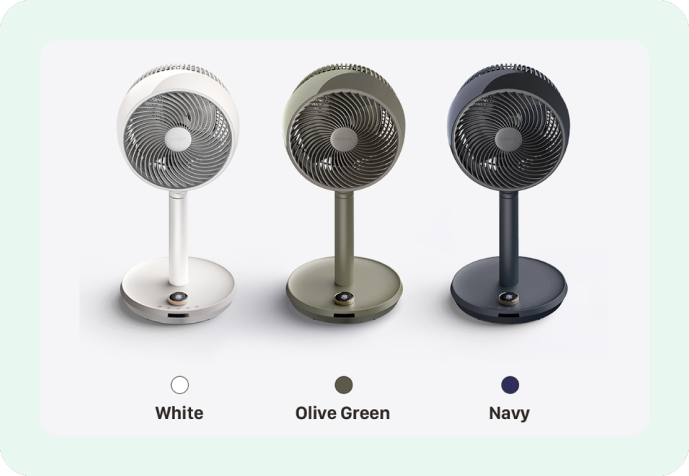 보통 써큘레이터나 선풍기들은 화이트, 블랙만 있는데 루메나 팬 그란데 색상들엔 화이트, 네이비, 올리브그린이 있어요.