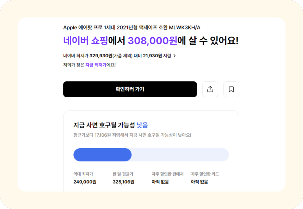 출처 - 네이버쇼핑 에어팟 프로 1세대의 역대 최저가는 (2021.10 등록 이후) 249,000원이에요. 하지만 한 달 평균가는 325,106원이에요! 역대 최저가와 한 달 평균가의 차이가 많이 나는데요. 그 이유는 여러 개가 있겠지만 이 제품이 예전에 출시된 제품인 탓도 있어요.