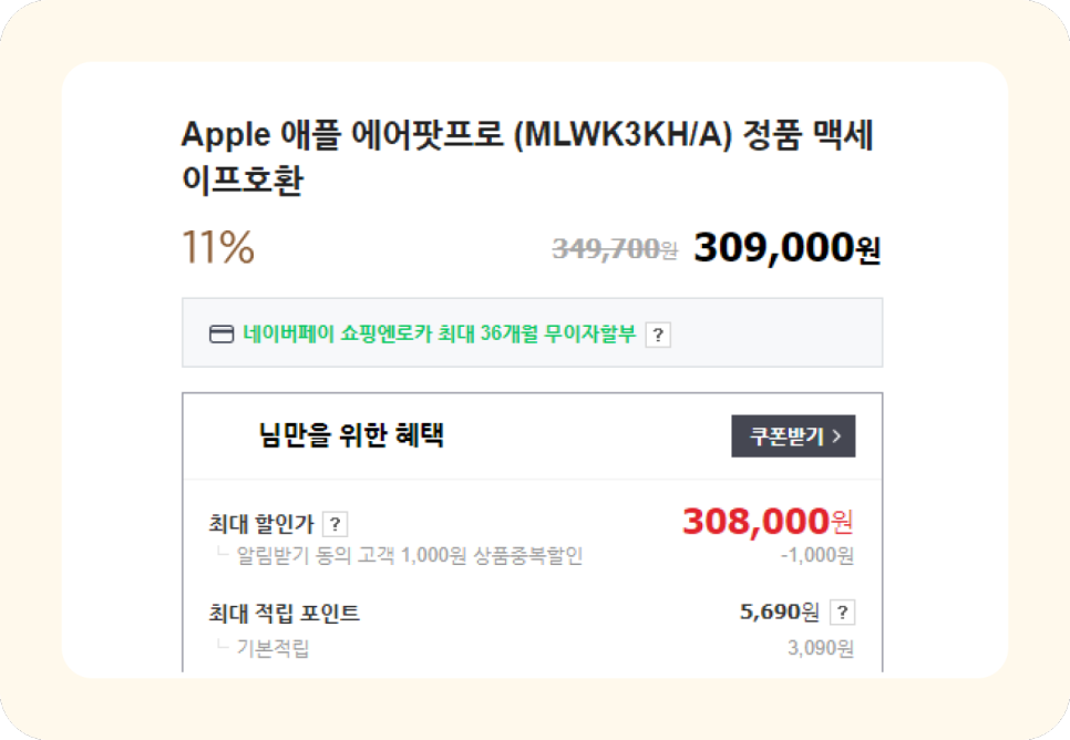 카드 할인 혹은 쿠폰 할인 없이 쿠팡 기본 할인으로 구매했었어요.