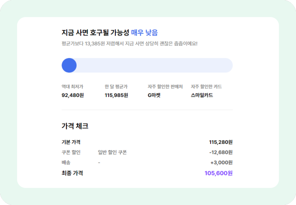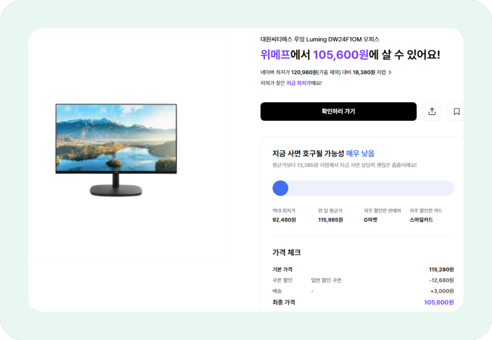 역대 최저가는 92,480원, 한 달 평균가는 115,985원인데