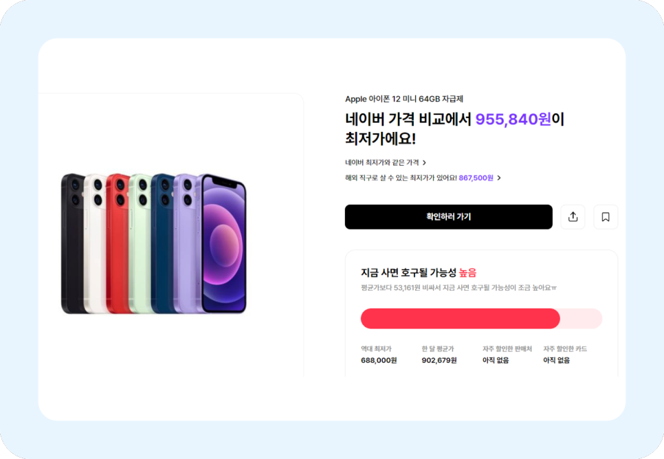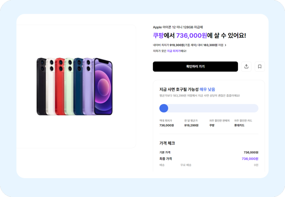 12미니 128GB의 사공사 최저가는 736,000원이에요! 네이버 최저가보다 무려 183,300원 저렴해요 😎😎