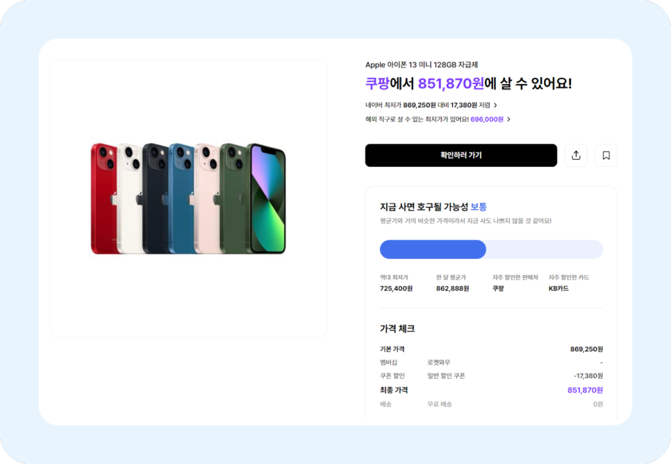 사공사에서 알려주는 13미니 128GB의 최저가는 851,870원이에요!