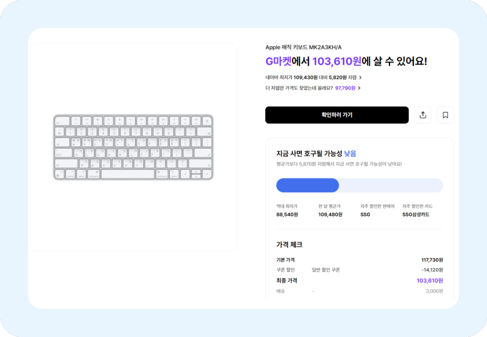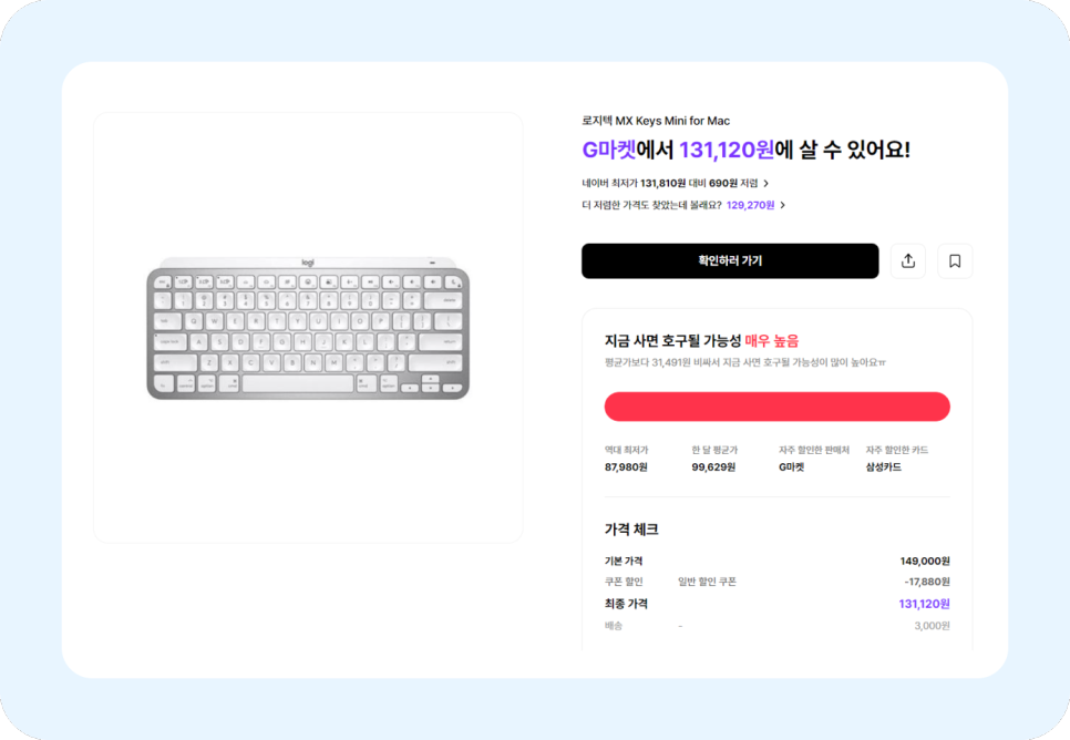 오늘 꼭 키보드를 구매하셔야 된다면, MX Keys보다는 매직 키보드 추천해 드릴게요. 평균가보다 약 6천 원 정도 저렴하거든요.