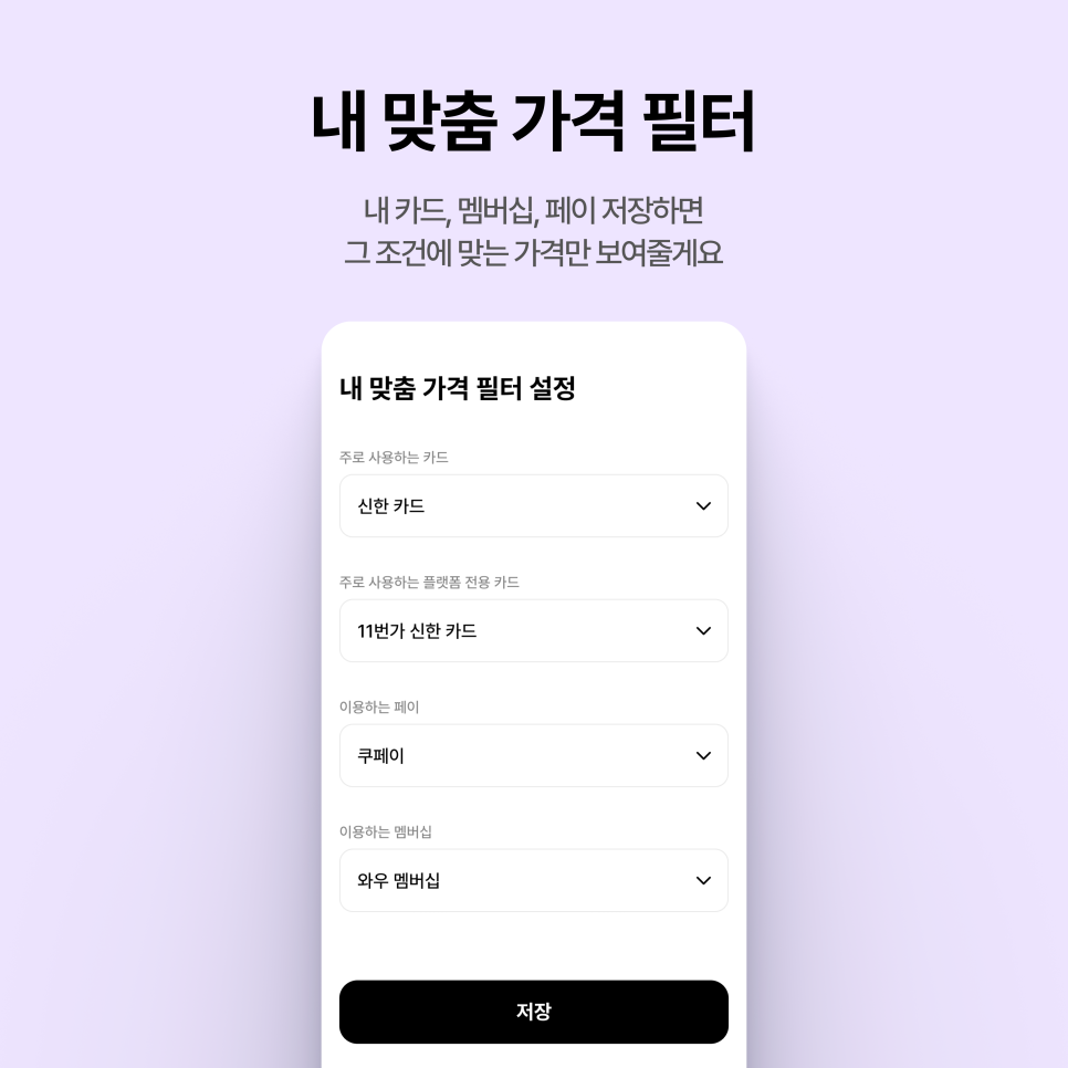 바로 내가 쓰는 카드, 멤버십, 페이를 저장해두면 내 조건에 맞는 가격만 볼 수 있어요!